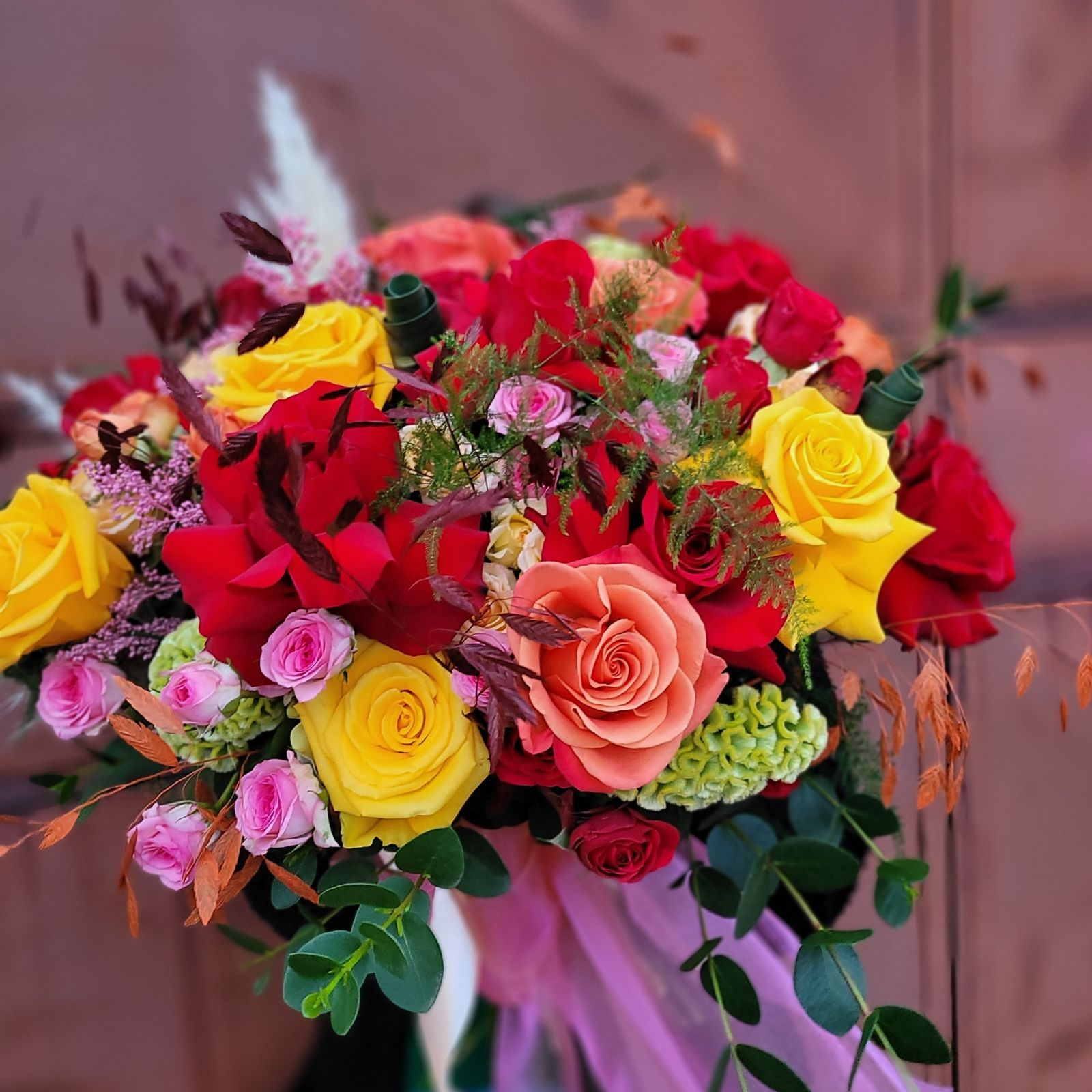 Un buchet spectaculos, creat pentru a impresiona din prima privire. Această compoziție florală îmbină armonios trandafiri în nuanțe de roșu intens, galben solar, somon delicat și roz pudrat, completate de accente elegante de verde și texturi naturale de pampas. Fiecare floare este aleasă cu grijă pentru prospețime și rafinament, transformând buchetul într-un adevărat simbol al bucuriei, recunoștinței și eleganței.