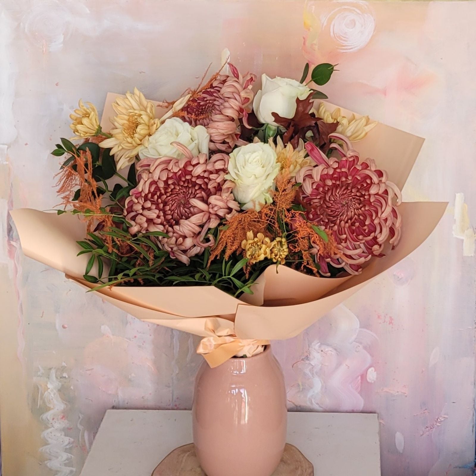 Alegeți să oferiți acest buchet celor dragi și sigur le veți însenina ziua. Acest buchet este realizat din trandafiri albi și crizanteme deosebite în culorile toamnei, este foarte elegant și în același timp foarte rezistent.