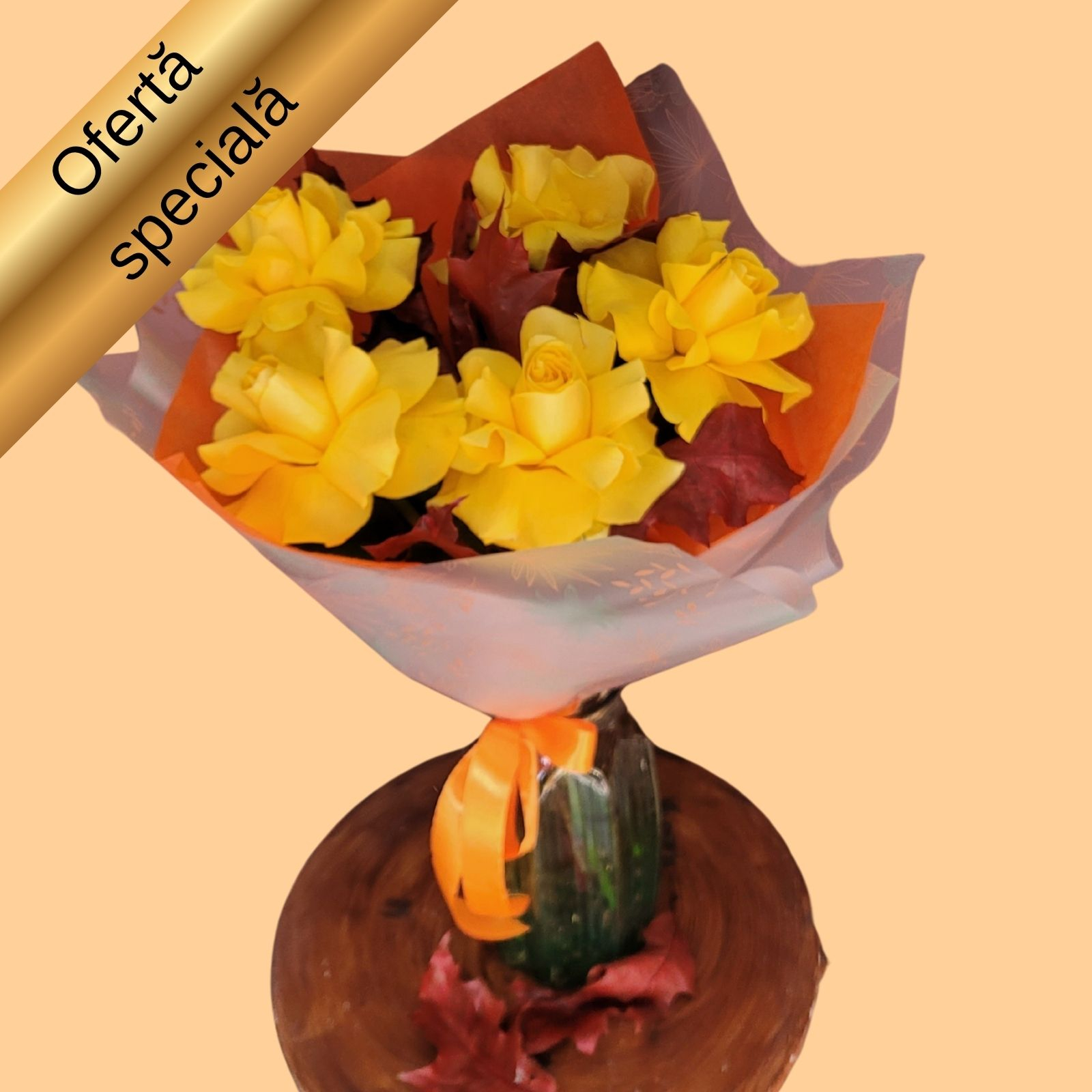 Buchetul conține 5 trandafiri galbeni premiun, frunze de quercus, verdeață decorativă, ambalaj și panglică de saten.