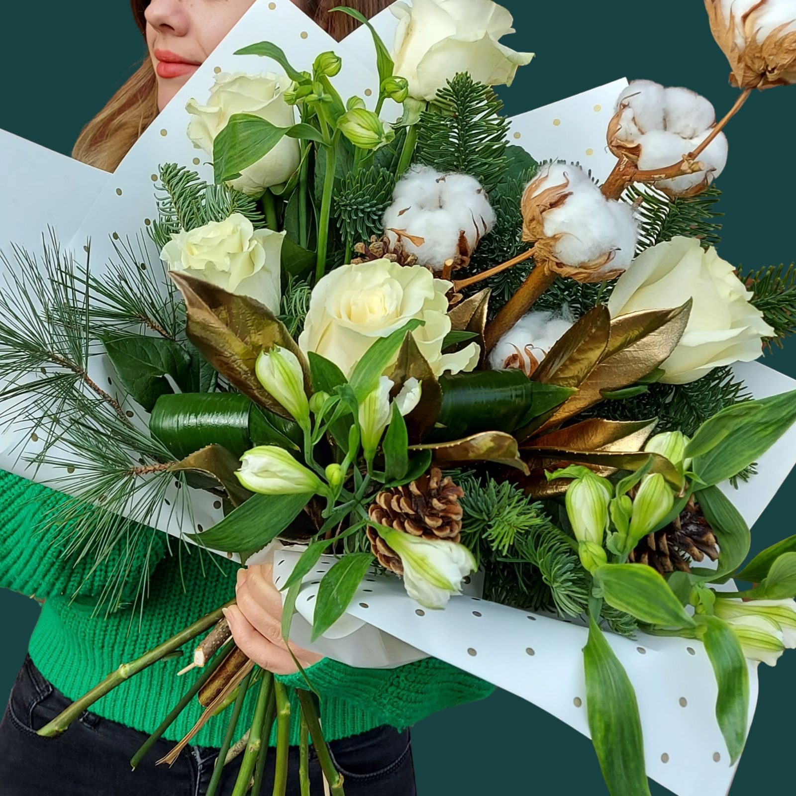 Dacă vrei să impresionezi o persoană dragă, să-ți arăți respectul, prețuirea sau iubirea, alege să o faci cu acest buchet simplu și elegant realizat de noi cu mare drag. Buchetul conține trandafiri albi, alstromeria, bumbac, conuri de brad, verdeață decorativă și ambalaj.