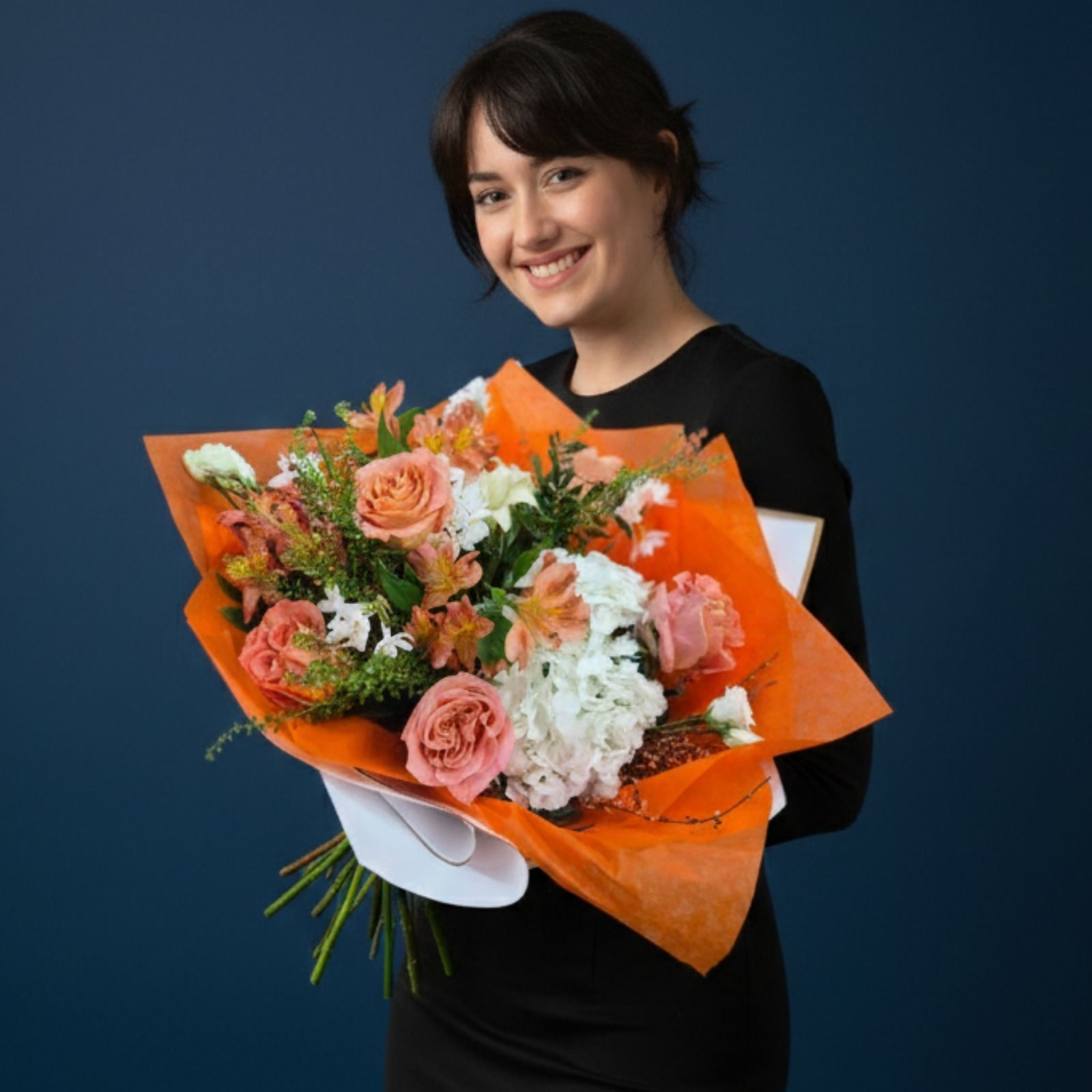 Un buchet sofisticat ce îmbină armonios nuanțele rafinate de piersică și alb, creat pentru a impresiona prin eleganță și echilibru. Trandafirii catifelați și hortensia se completează perfect cu accentele florale delicate, conturând un aranjament luxuriant și modern. Ambalajul în tonuri vibrante evidențiază frumusețea naturală a florilor și adaugă o notă contemporană, transformând buchetul într-o veritabilă declarație de stil. Ideal pentru momentele în care dorești să transmiți admirație, rafinament și emoții autentice.