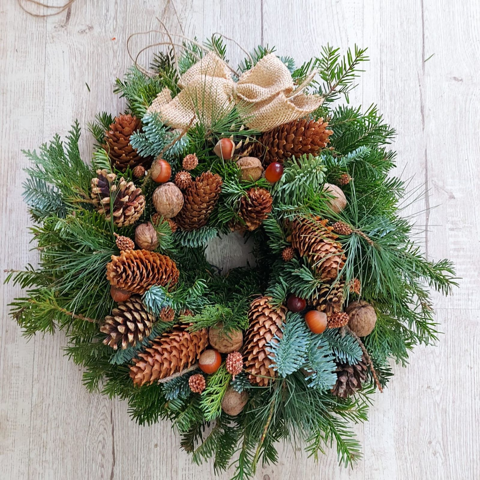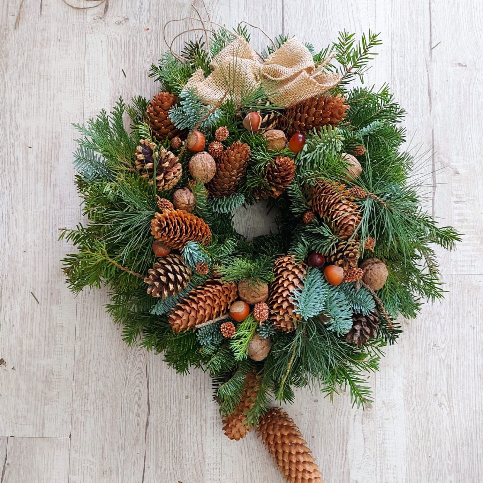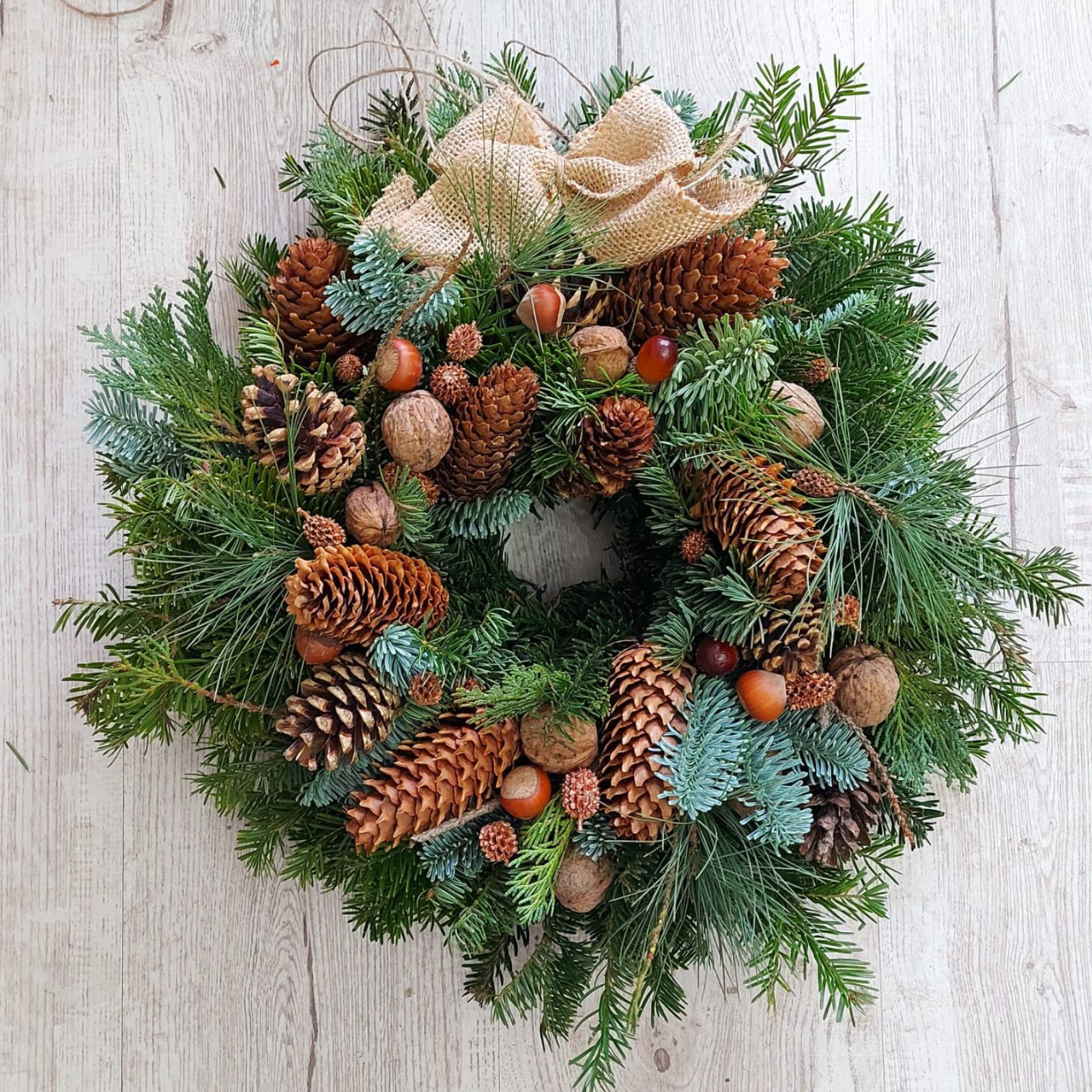 Aduceți magia și bucuria Crăciunului în casa dumneavoastră sau a celor dragi cu această coroniță realizată din crenguțe de brad Nordmann, brad Nobilis, tuia argintie și pin decorată cu elemente naturale precum conuri de brad, conuri de pin, nuci.