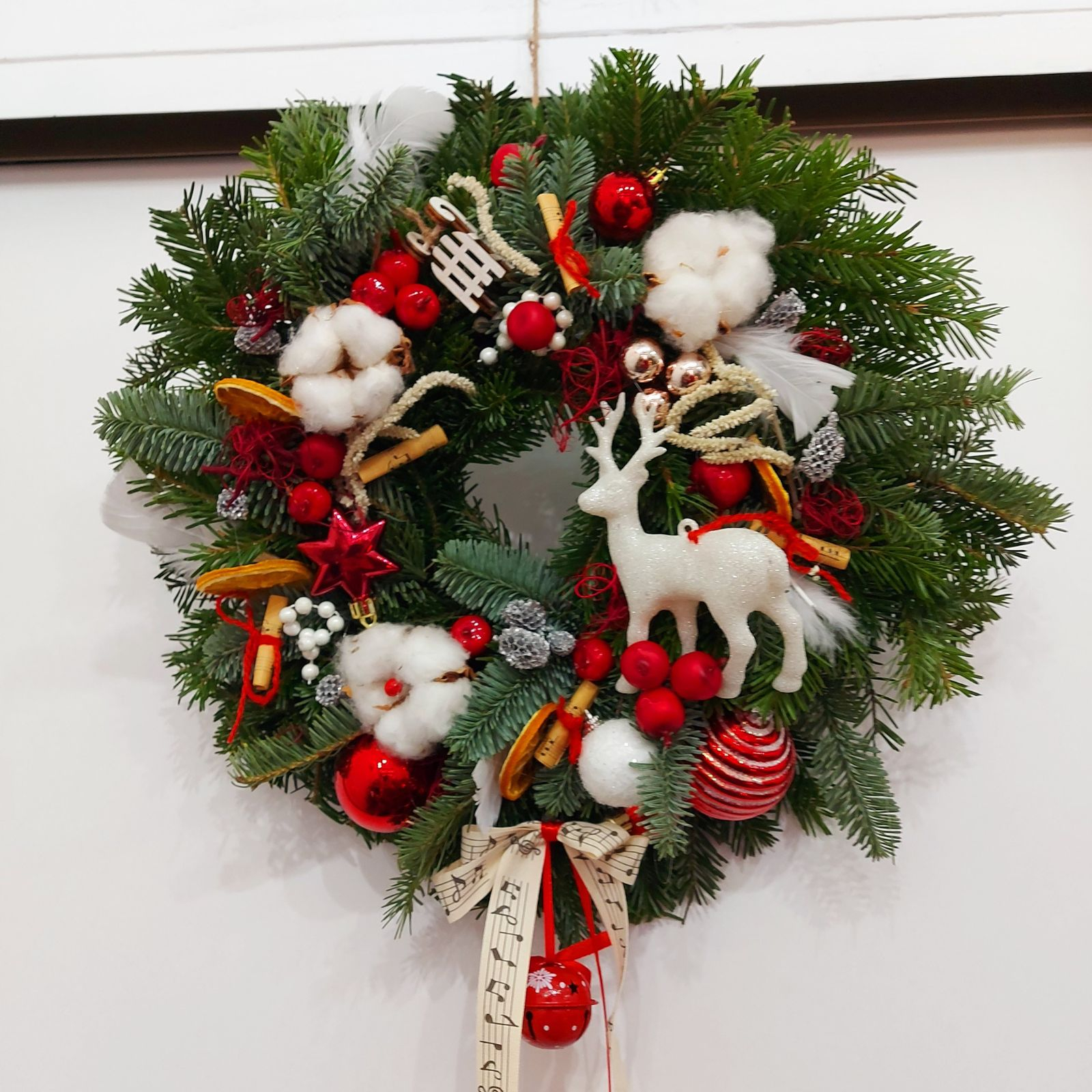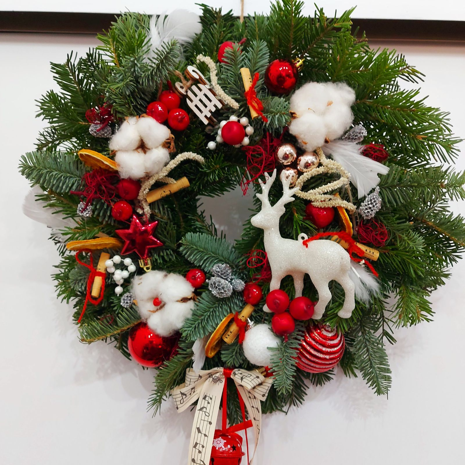 Această coroniță de Crăciun aduce magia sărbătorilor printr-o combinație vibrantă de elemente decorative. Realizată din ramuri naturale de brad, coronița este decorată cu globuri roșii, conuri de brad, bumbac pufos, panglici festive și un ren alb strălucitor ca element central. Accentele aurii și argintii adaugă un plus de eleganță, iar panglica decorativă subliniază tema sărbătorilor pline de bucurie. Este ideală pentru a fi agățată pe ușa de la intrare sau în interior, creând o atmosferă caldă și primitoare.