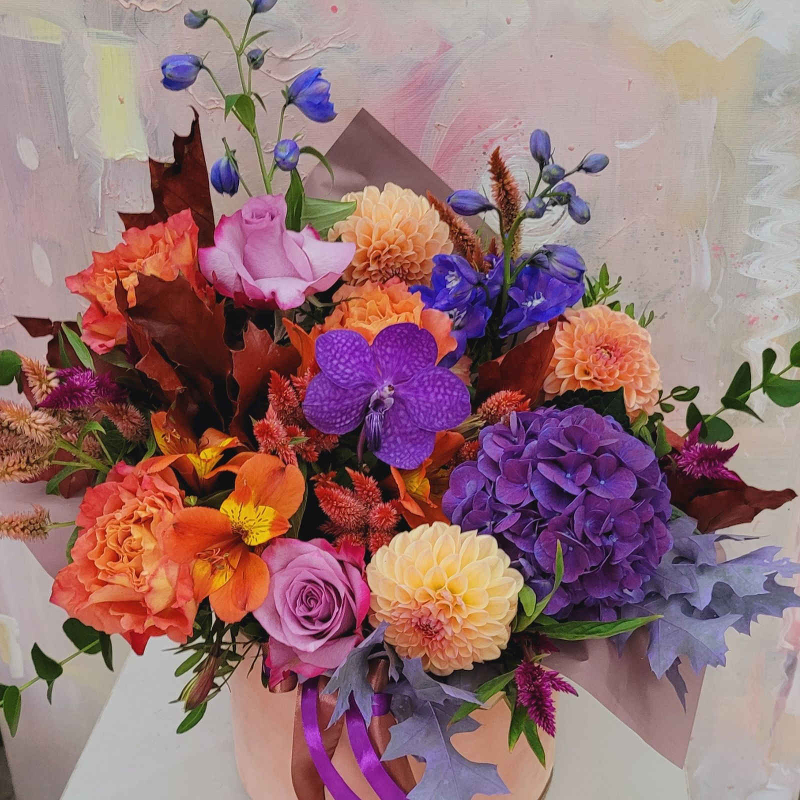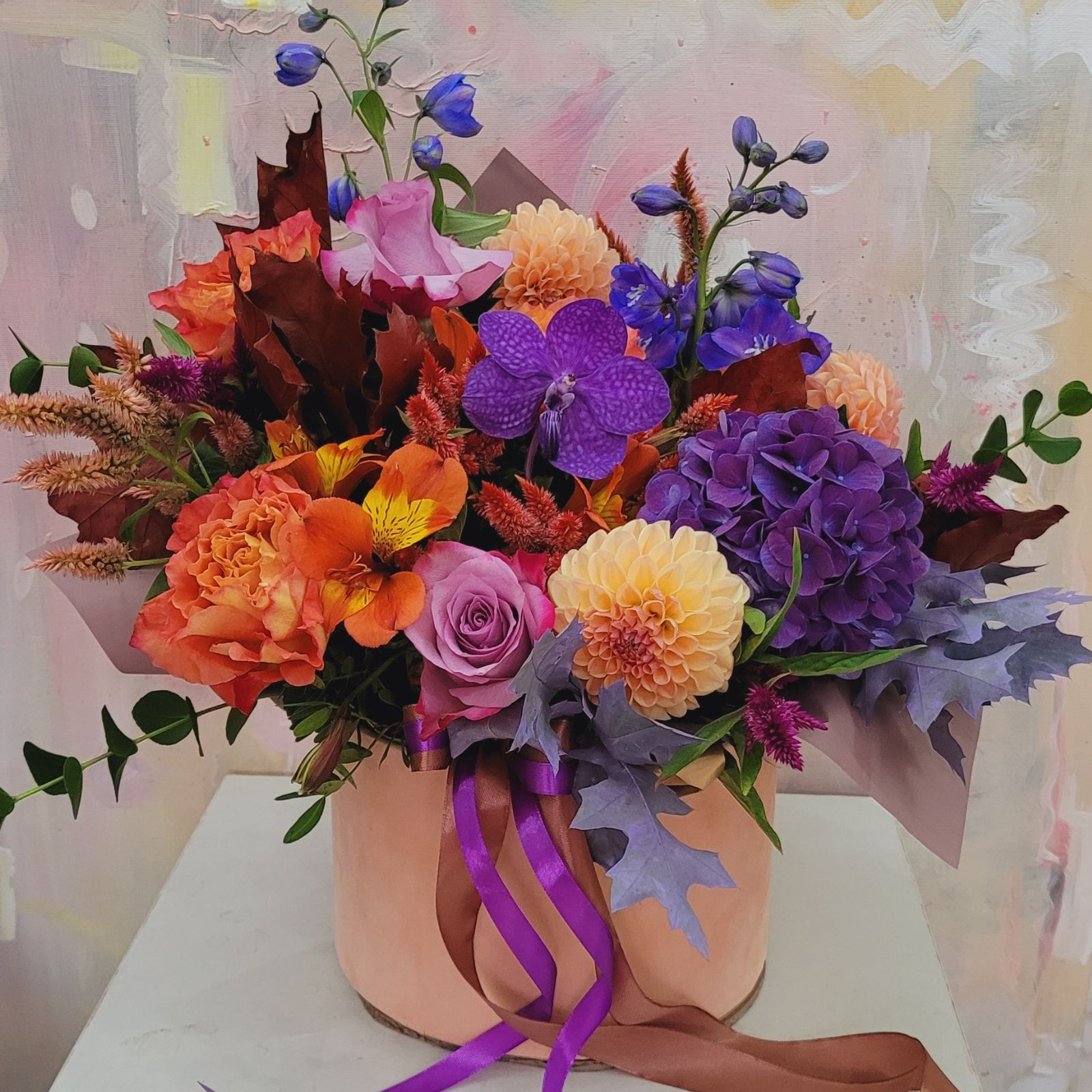 Un aranjament floral de toamnă, realizat într-o cutie rotundă, catifelată, în nuanțe de piersică. Aranjamentul îmbină armonios culorile toamnei cu accente vibrante: tonuri de piersică și portocaliu, trandafiri mov, hortensii violet, orhidee exotice mov intens și mici detalii albastre ce dau profunzime. Frunzele ruginii și verdele crud al ramurilor completează compoziția, aducând un contrast cald și rafinat. Este un aranjament plin de energie, dar și elegant, care transmite bucurie, creativitate și vitalitate.