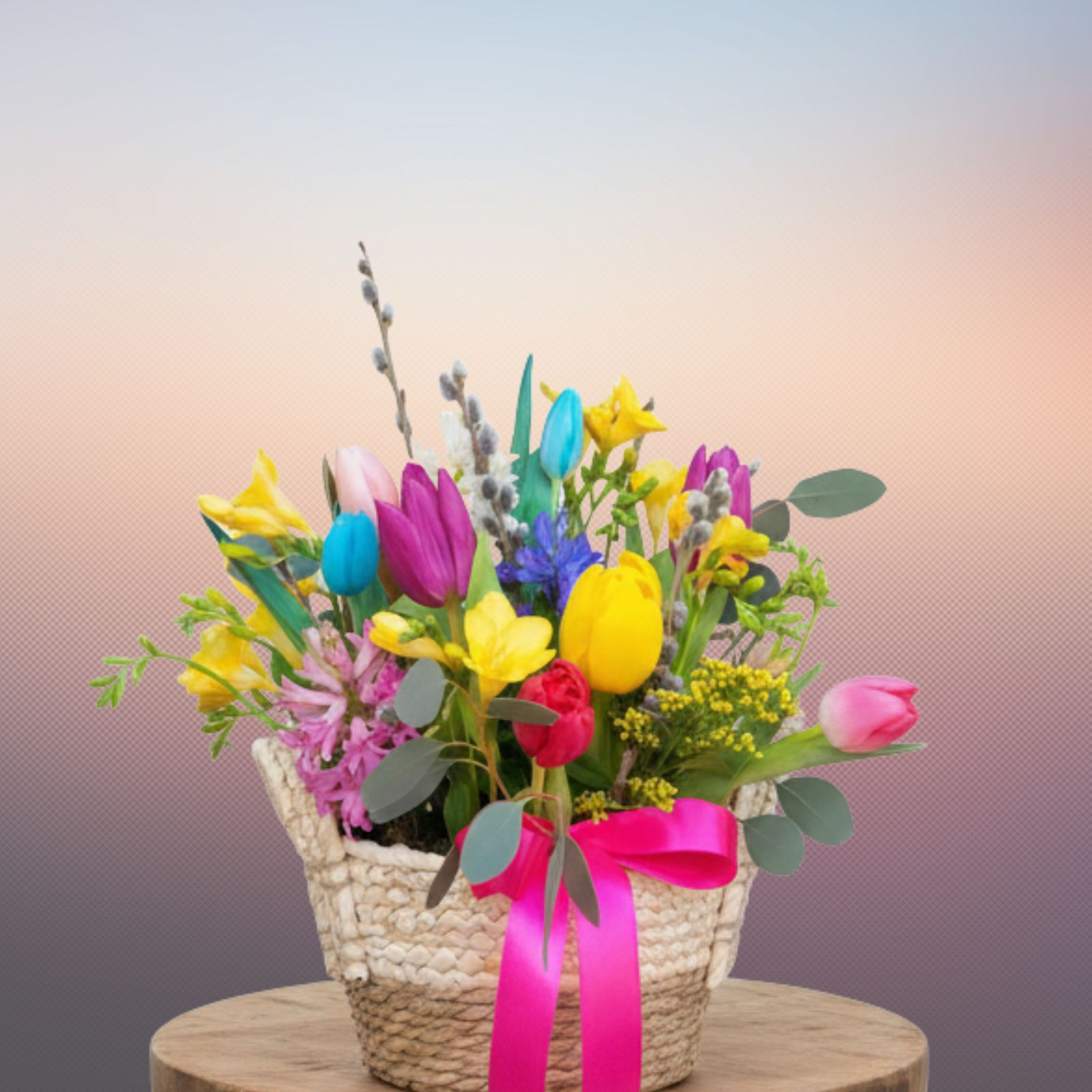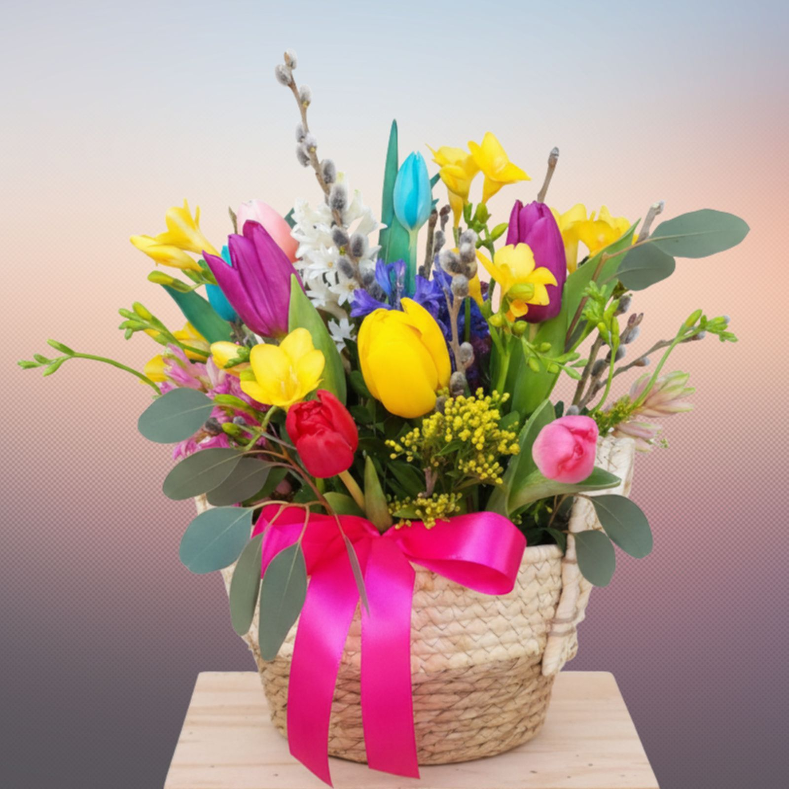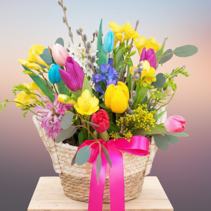 Dăruiește acest aranjament cu cele mai frumoase, parfumate și vesele flori ce sigur îi vor aduce zâmbetul pe buze și-i vor lumina ziua. Acest aranjament este potrivit oricărei ocazii sau puteți să-l dăruiți fără vreun motiv anume, doar pentru a o face să se simtă specială. Aranjamentul este realizat într-un coșuleț și conține zambile, frezii, lalele, crenguțe de salix, verdeață decorativă și alte materiale specifice.