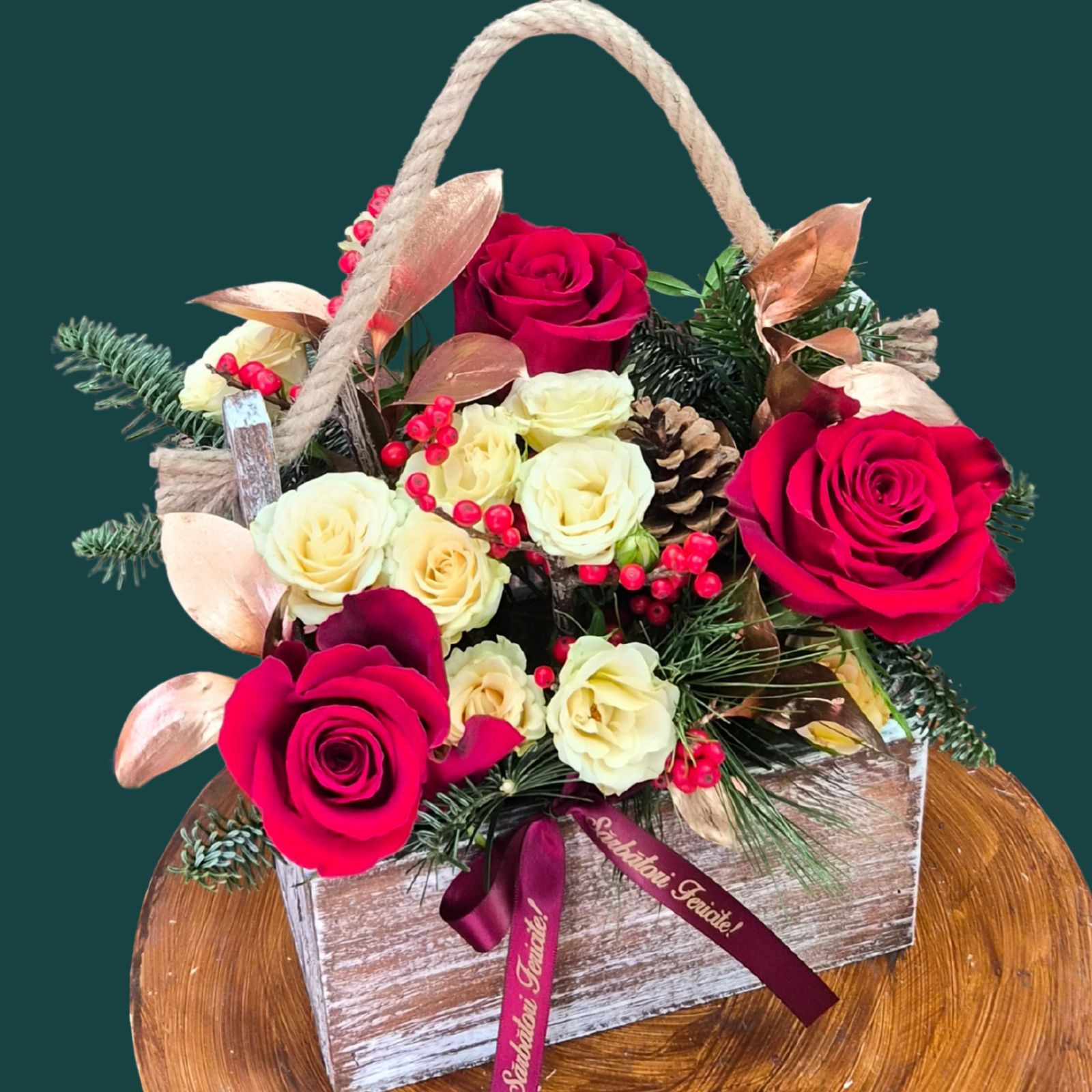 Acest aranjament festiv, creat într-o lădiță rustică handmade din lemn, îmbină armonios eleganța trandafirilor roșii cu rafinamentul minirozelor crem. Accentele de ilex roșu, conurile naturale, crenguțele de brad și frunzele metalizate aurii aduc un aer cald, luxuriant și autentic de sărbătoare.