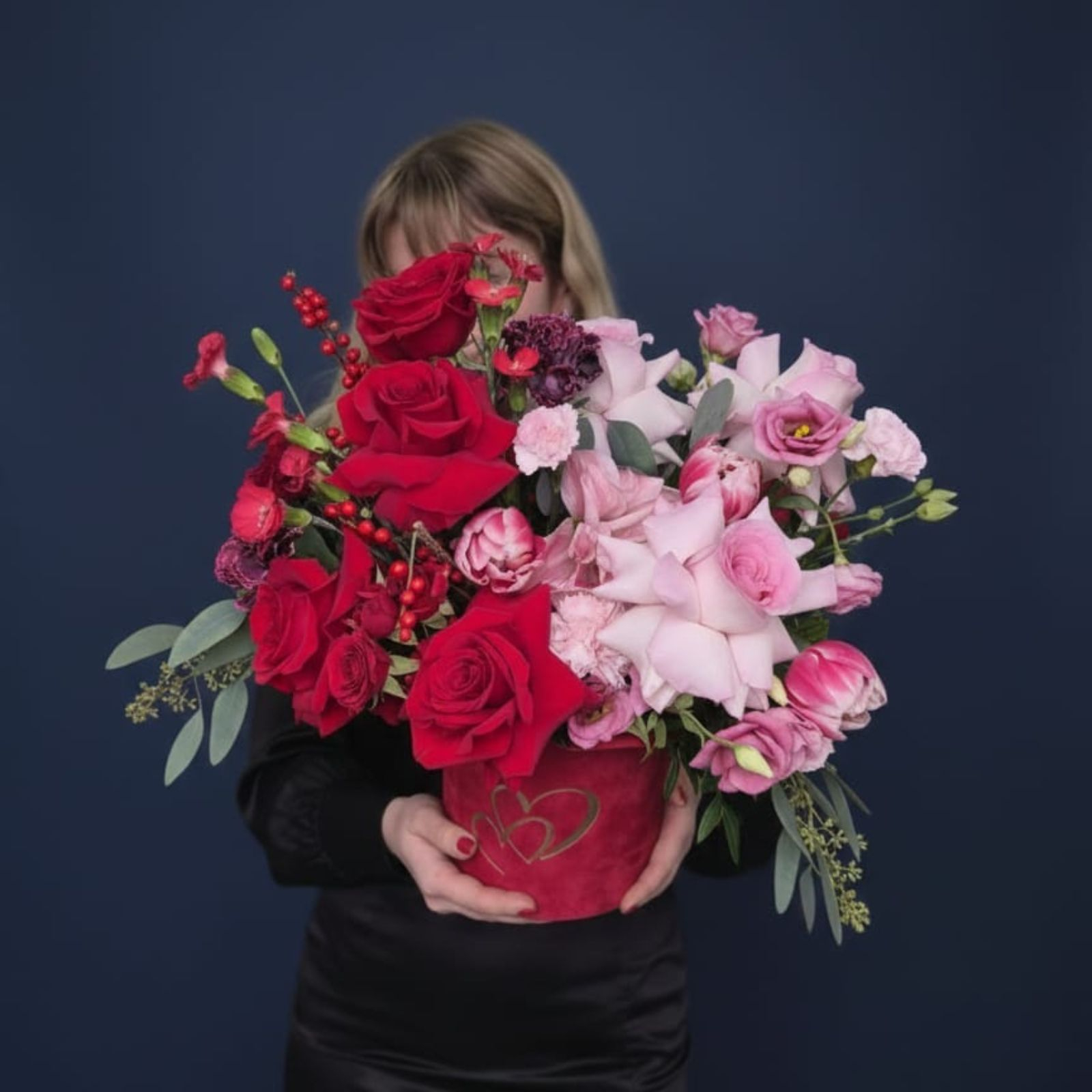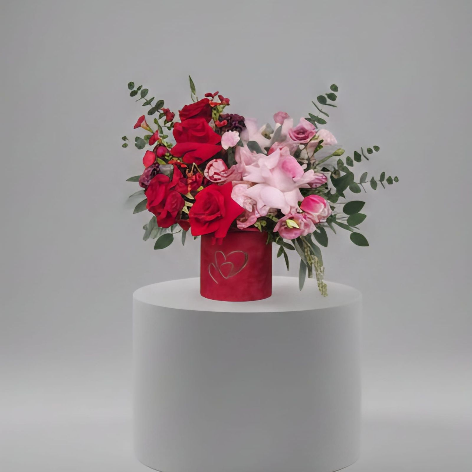 Exprimă-ți sentimentele fără cuvinte cu acest aranjament floral spectaculos, creat special pentru a celebra iubirea. Realizat într-o cutie de catifea roșie premium aranjamentul îmbină pasiunea trandafirilor roșu aprins cu delicatețea florilor de un roz pudrat. Accentele de eucalipt argintiu oferă volum și un parfum proaspăt, transformând acest cadou într-o experiență senzorială de neuitat.